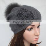 Myfur Elegant Women Flower Cashmere Wool Knit Beanie With Soft Fox Fur Pom Pom