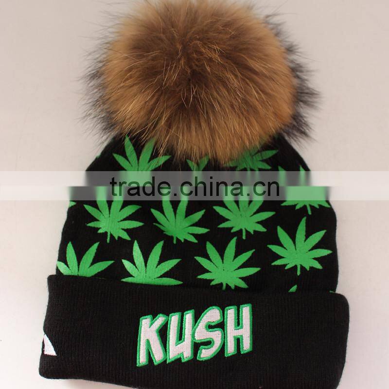 Home > Products > Pom Pom Hat > Myfur Adult Screen Green Leaf Printed Skull Hat With Real Fur Pom Pom