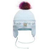 Myfur Baby Blue Wholesale Cotton Earflap Crochet Hat With Detachable Fur Pom Pom Top
