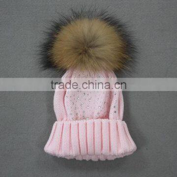 Myfur Baby Pink High Quality Wool Acrylic Knitting Hat and Cap With Raccoon Fur Ball Wholesale