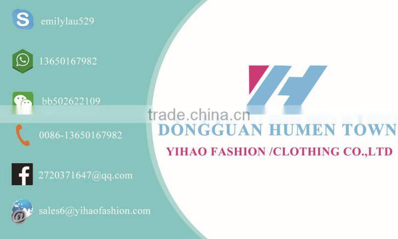 Dongguan Humen Yihao Fashion Co.,LTD is a professional garment factory which locates in the China Fashion Capital-Humen Town.It is an advanced private enterprise engaged in the development,production and sales of garment.Since it was established in 1999,our company develops very quickly and now can produce over 1000,000 pieces of various clothes every year .We specialize in manufacturing and women's knitted and woven clothing, such as fashion dress, party dress, casual dress, skirt shorts, T-shirts,polo shirts,blouse,hoody jacket garments etc. We have established stable sales network through electronic business platform(Alibaba)and other sales channel,As the "pearl river delta" as the center to expand to the nation and all over the world,,our products sell well in many countries and areas including countries such as Australia, USA, Spain, UK, Canada and Sweden after 10 years development ,now we have good management level , production ability,strict guarantee of products quality and delivery time,gradually formed the international payment terms of L/C.It can adapt to the market demands and meet customers expectations as well.