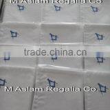 We can make all kinds of Masonic Products such as White Cotton Gloves,Masonic White Cotton Handkerchief, Ties, Highh quality Lambskin Aprons,Undress and Fulldress Apron Collars,Masonic Soft Case, Masonic Breif Cases, Masonic Hot Case, Artificial Leather Uniforms Aprons, Sashes, Collar ,Hand Embroidery Badges and all other Uniforms & Accessories .Please inquiry us for best deal with us.