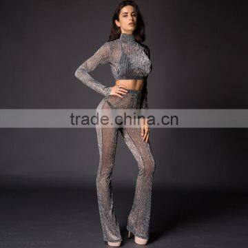 Runwaylover 084 Europe Style Ladies Two Piece Suits , Women Sexy Turtleneck Crop Top And Transparent Casual Pants