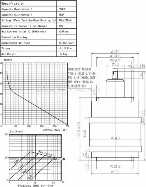 The CKTB250/28/138 capacitor use vacuum as dielectric with ceramic envelope ,which have the following features:High voltage , Small size , High Q value, Stabilization capability , High reliability ,Low price.