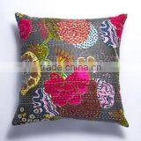 Grey Kantha Pillow Cover Indian Floral Pillow Handmade Throw Pillow 16X16
