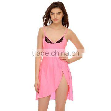 Own this beauty and woo him with splendid glamour.This piece of night wear falls elegantly on your body and the sexy high slit adds on to the vivacity.The lacy neck line gives it a touch of class and adds on to the exquisiteness.Colour: Pink Care: Handwash 30°C. Do not bleach. Do not iron. Drip dry in shade This sensual pink nightwear is crafted from blended lycra for optimum comfort and soft feel.Blended Lycra