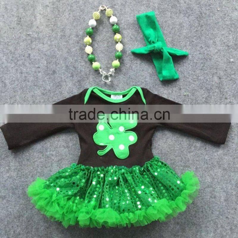 2016 new St Patrick shamrock paillette tutu dresses girls baby kids clothes romper with matching necklace and headband set