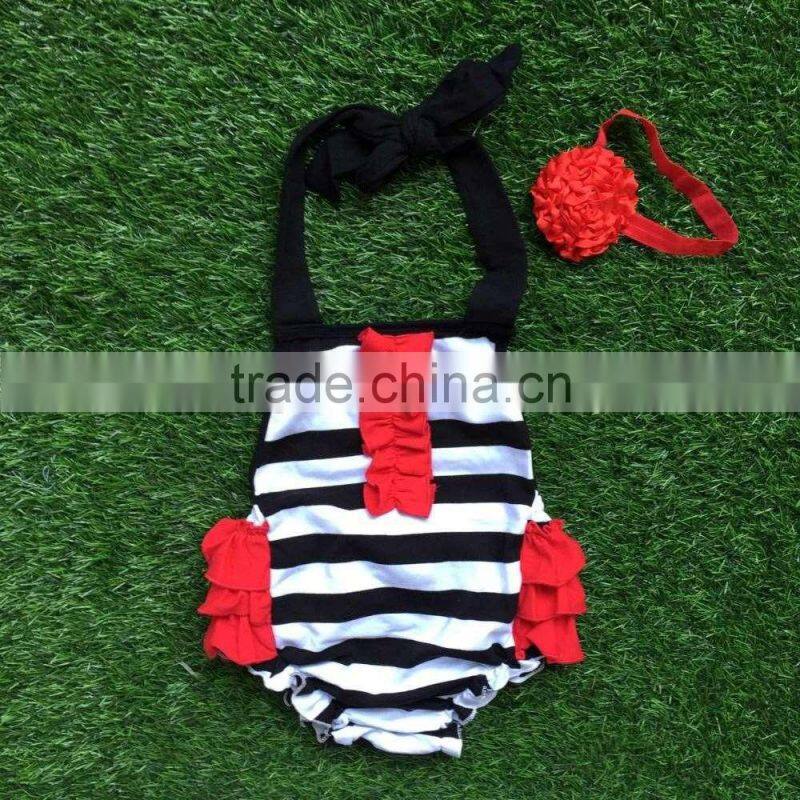 2016 new baby girls kids red and black stripe romper infant clothing baby kids wear with matching headband set