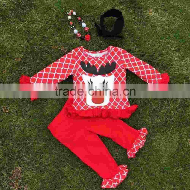 baby clothes Wholesale winter/fall boutique red Grid clothes ruffle outfits reindeer with necklace and headband
