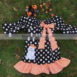 2015 New Arrival Girl Ghost Print Dress Kids Boutique Dress Girl Black and White Polka Dot Halloween Dress With Necklace and Bow