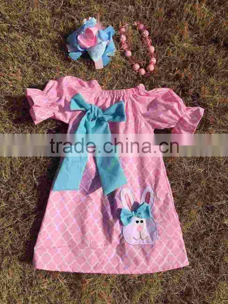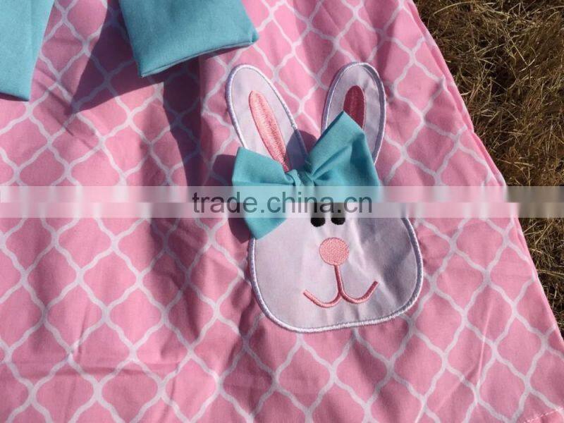 2015 Baby Girls Easter Pink Quatrefoil Teal Bunny Dress Kids Clothes With Necklace and Bows Set