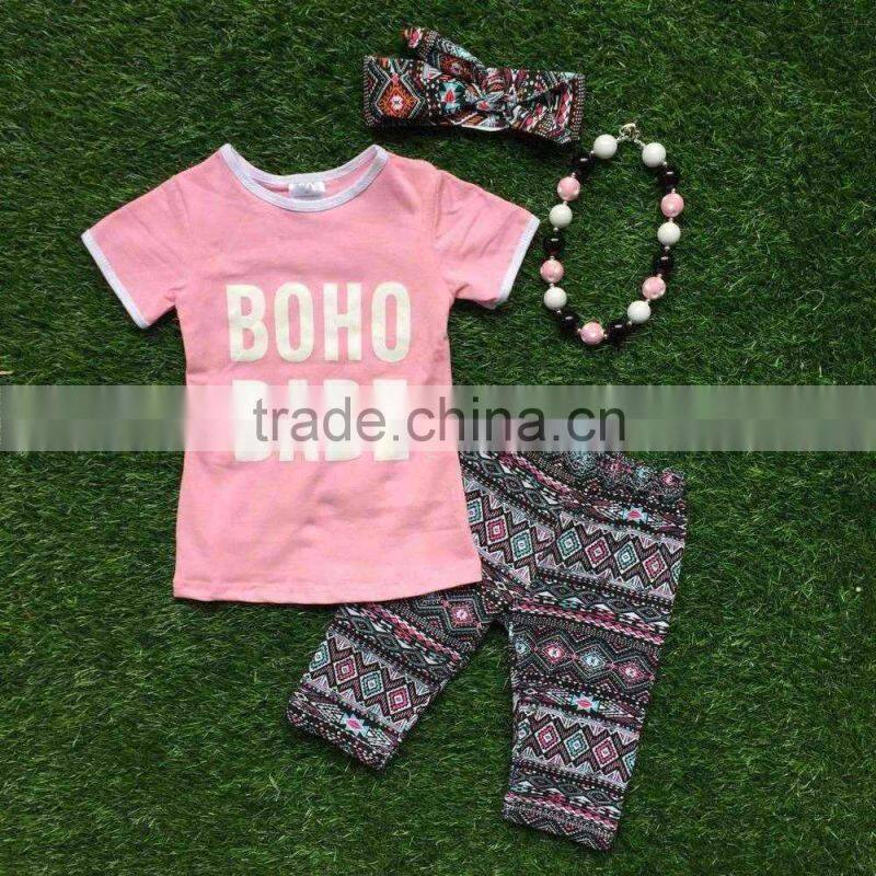 2016 Summer girls outfit BOHO BABE set pink short sleeves baby kids boutique 1-9 years old girls clothing with accessories
