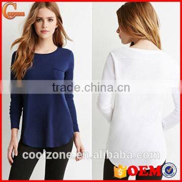 100%Cotton long sleeves t shirt women curved-hem pocket t shirts wholesale