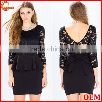 Three-quarter sheer sleeves V back peplum lace dress design |