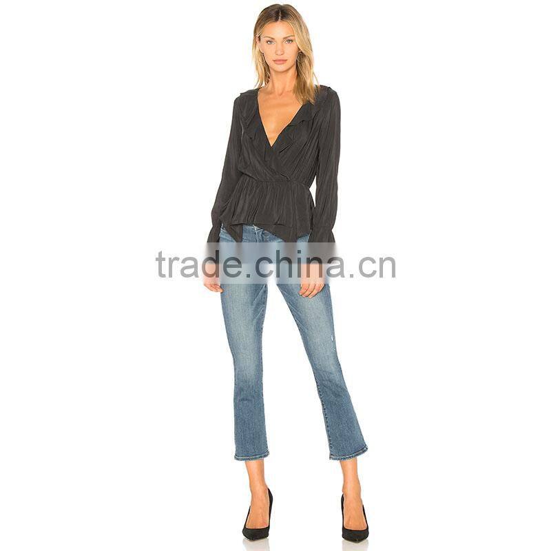 Frilled wrap design chic long sleeve black peplum blouse for women