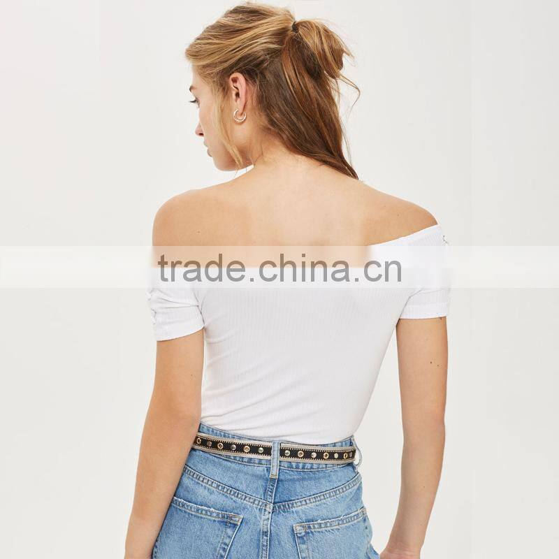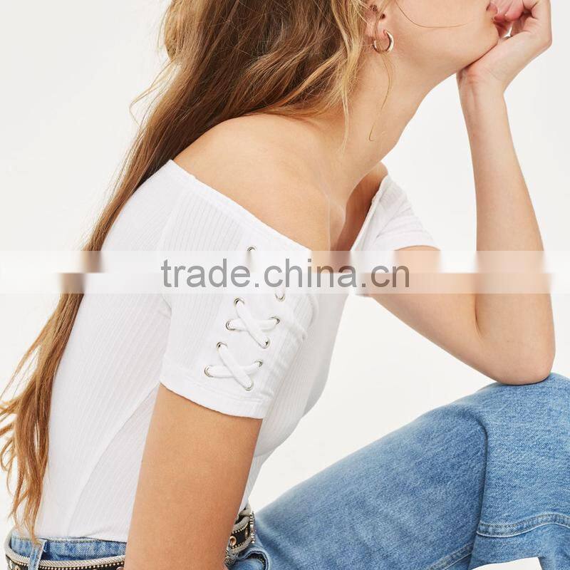 Drawstring eyelet ribbed top bardot neckline off shoulder bodysuit