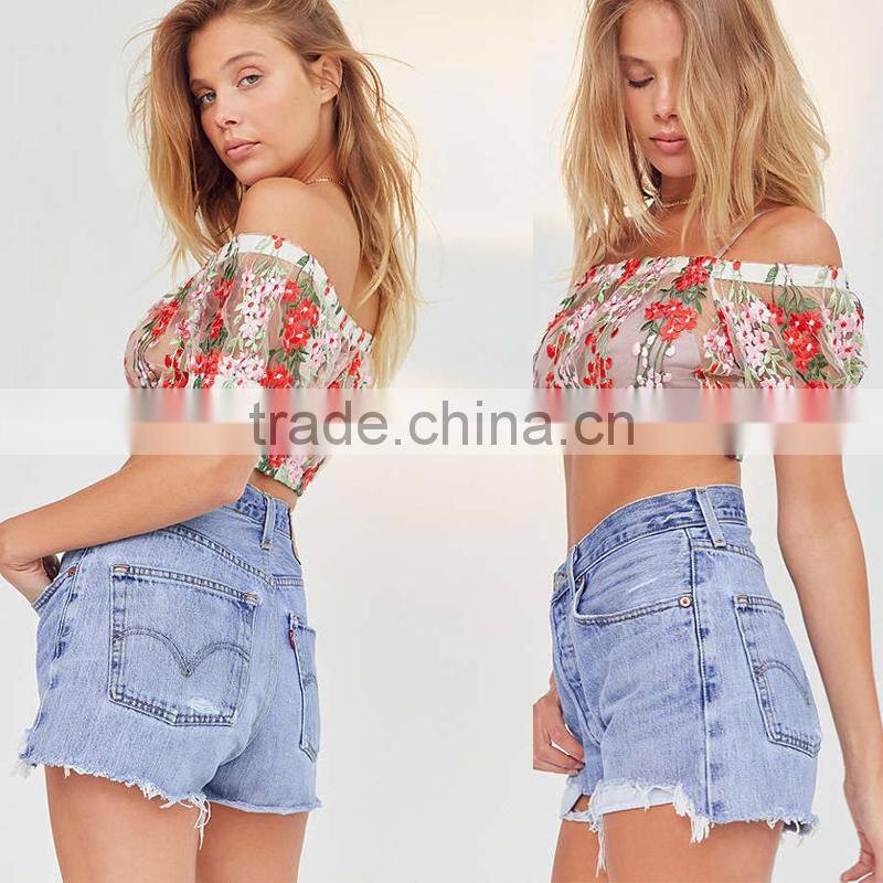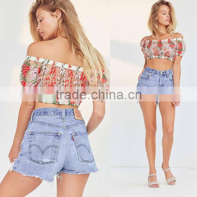 Sexy mesh embroidered floral tops off shoulder ladies blouse