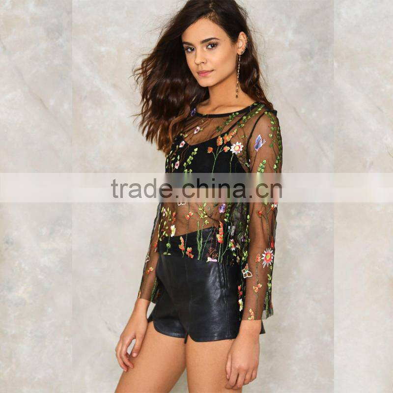 Sexy mesh embroidered blouse lady latest fashion design top