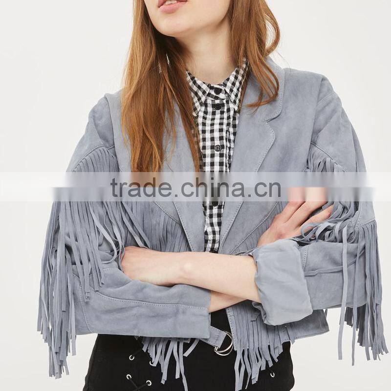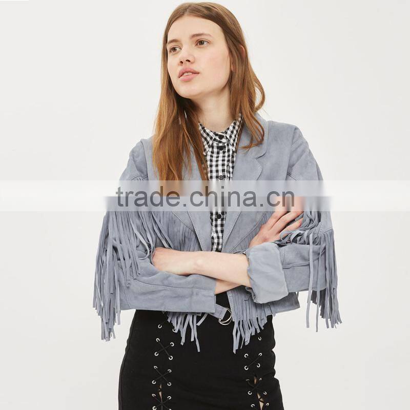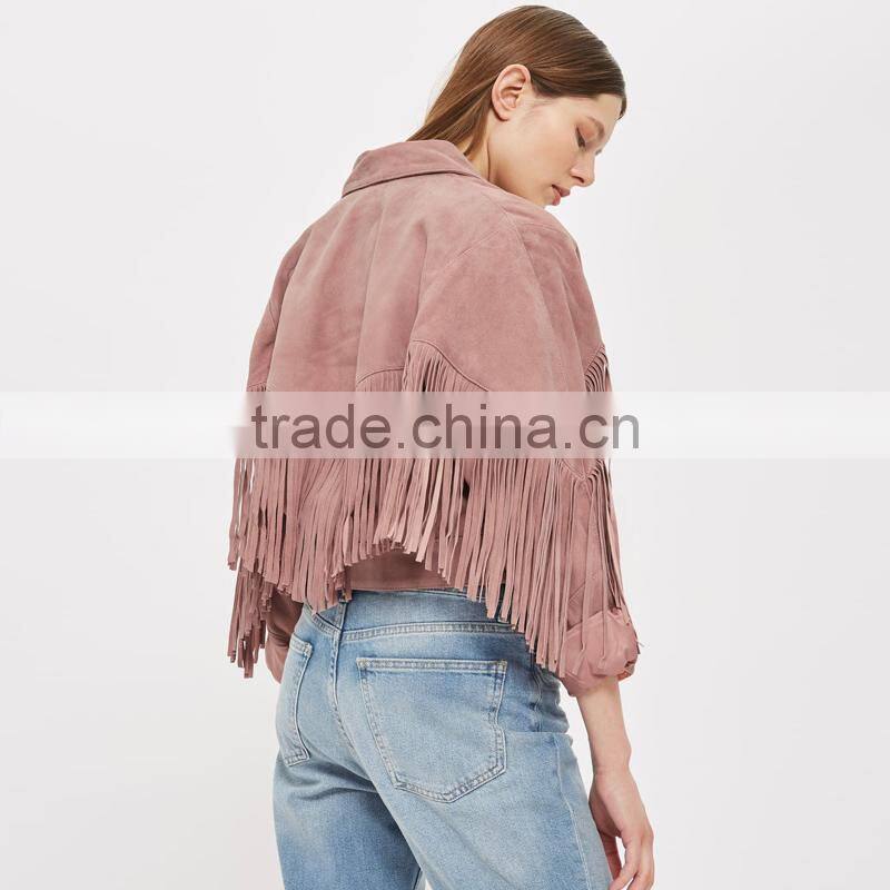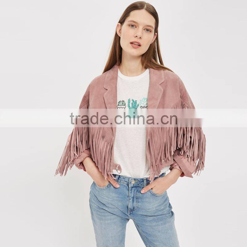 Lapel collar fringed short coat womens faux suede tassel bomber jacket