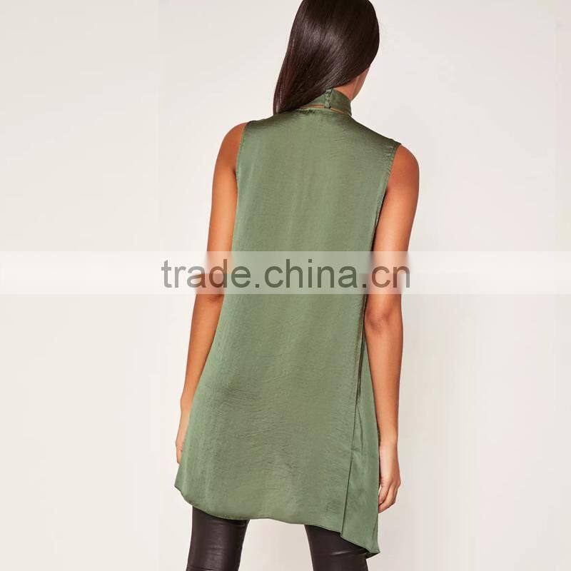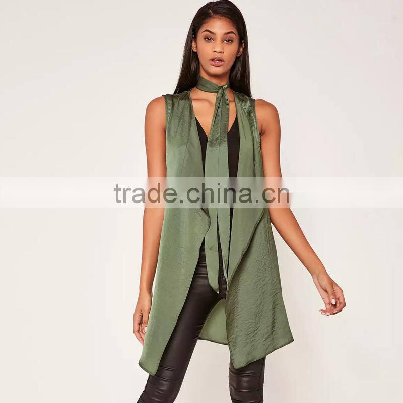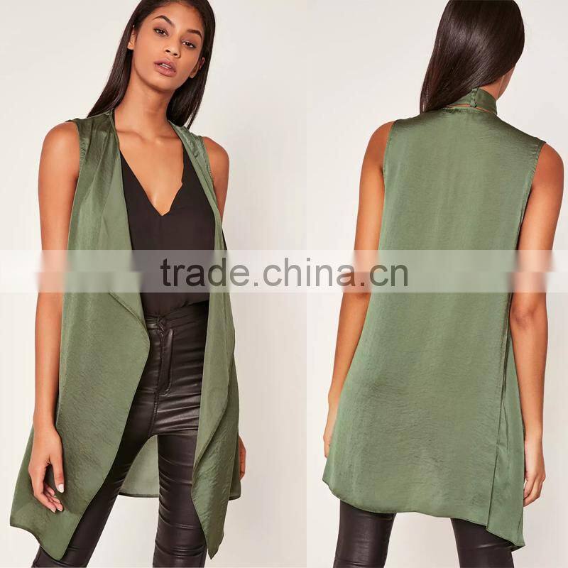 Light weight crepe sleeveless cardigan women's khaki green waistcoat