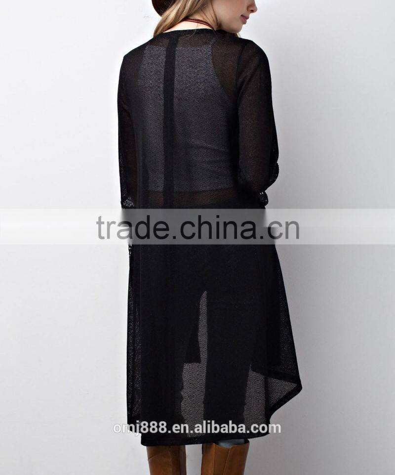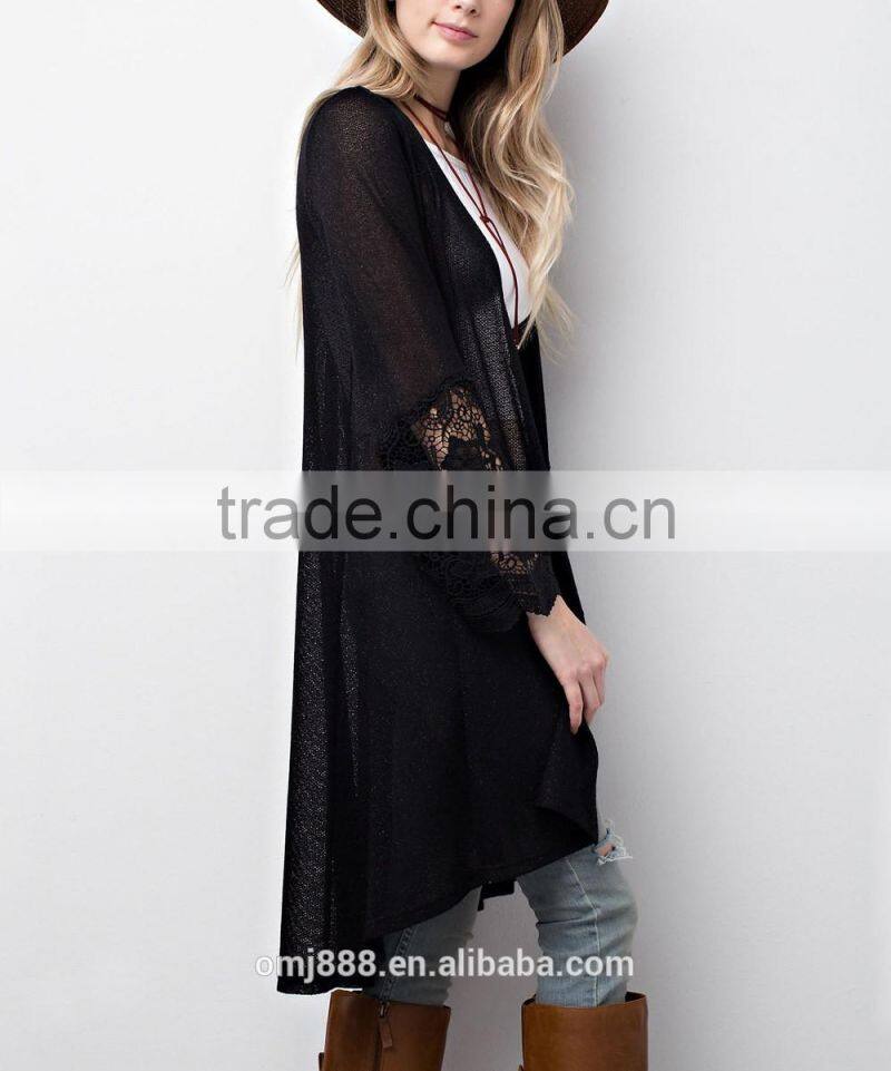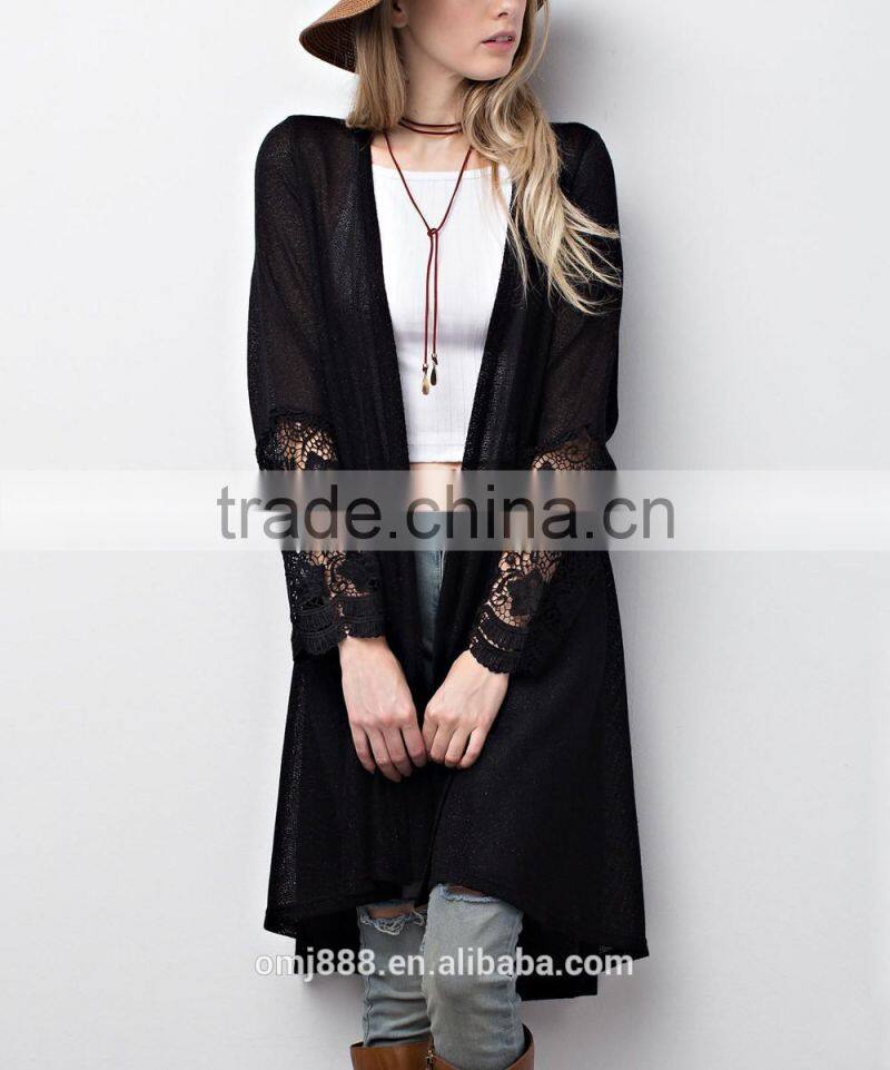 custom women knitted long open lace trim cardigan