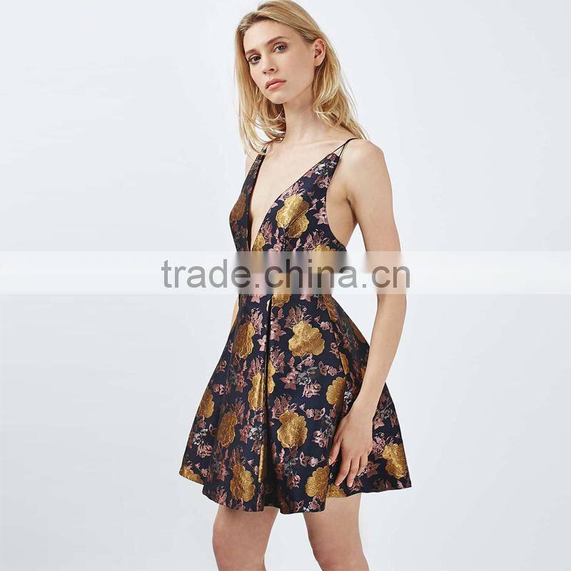 Vintage royal jacquard cross back plunge sleeveless short skater prom dress