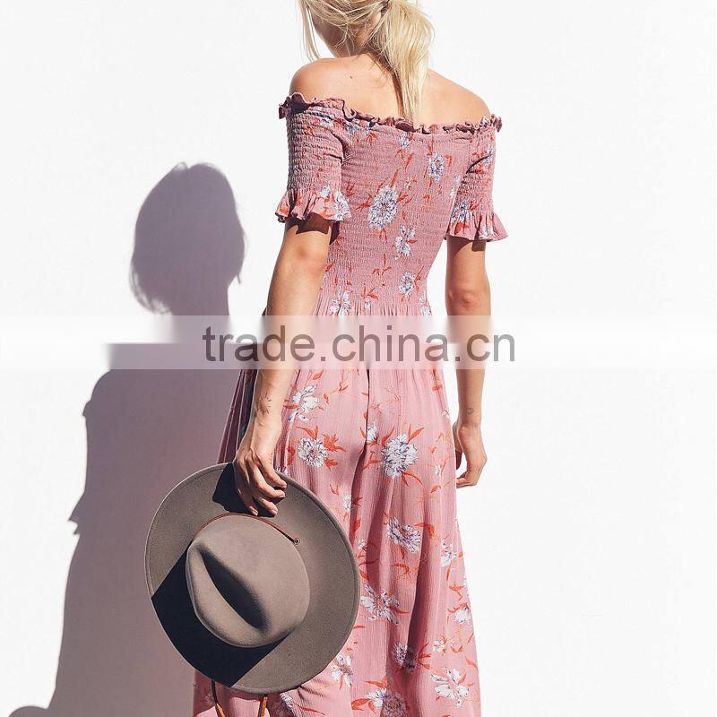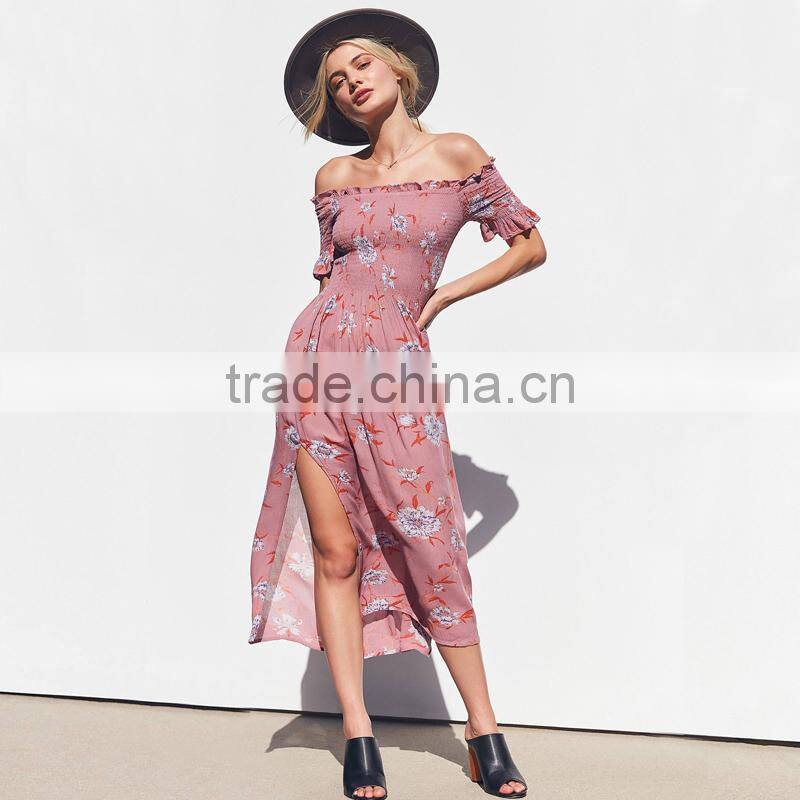 Lady's smocked dress with slit off the shoulder floral long maxi dresses