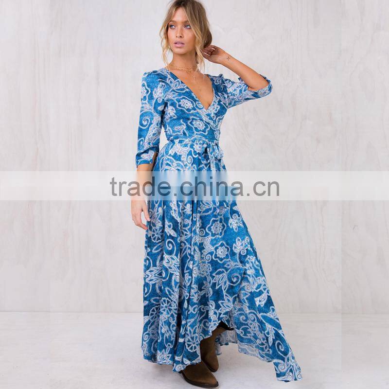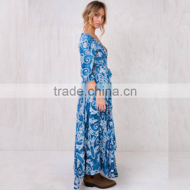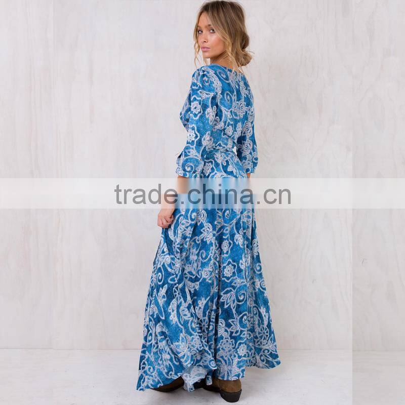 Paisley print long sleeve maxi wrap dress in blue for mature women