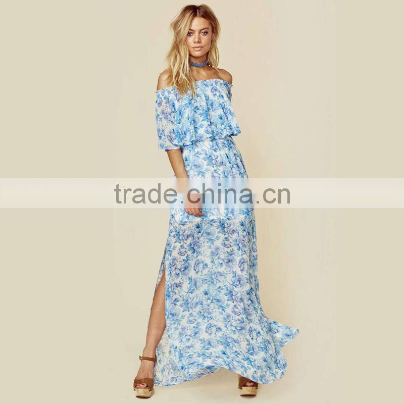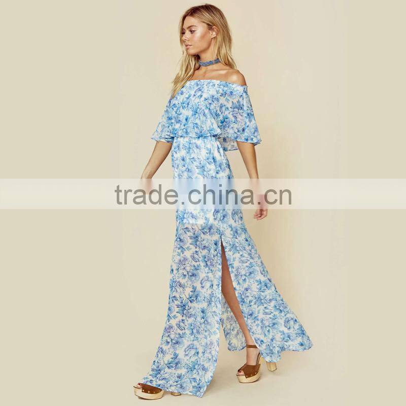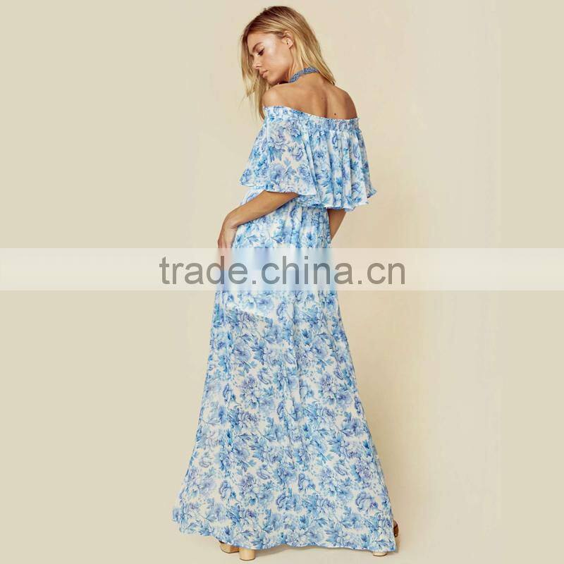Peony Blue Floral Mumu Dresses 2018 Womans off Shoulder Maxi Dress