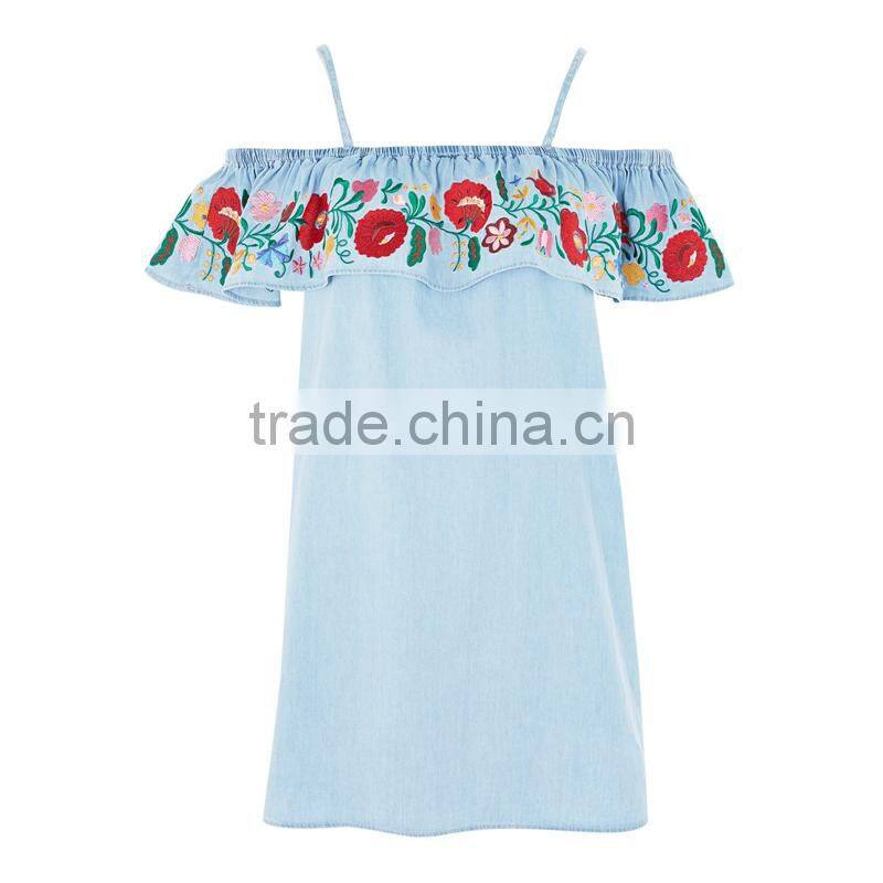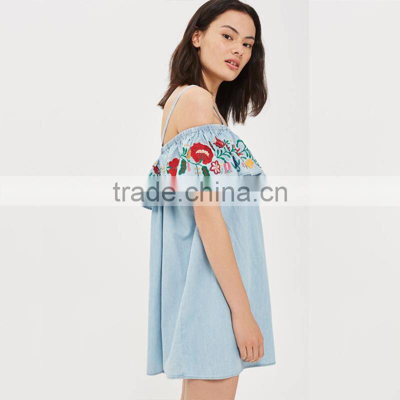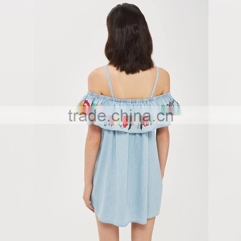 Denim blue embroidered new pattern clothes off shoulder short jeans dress women