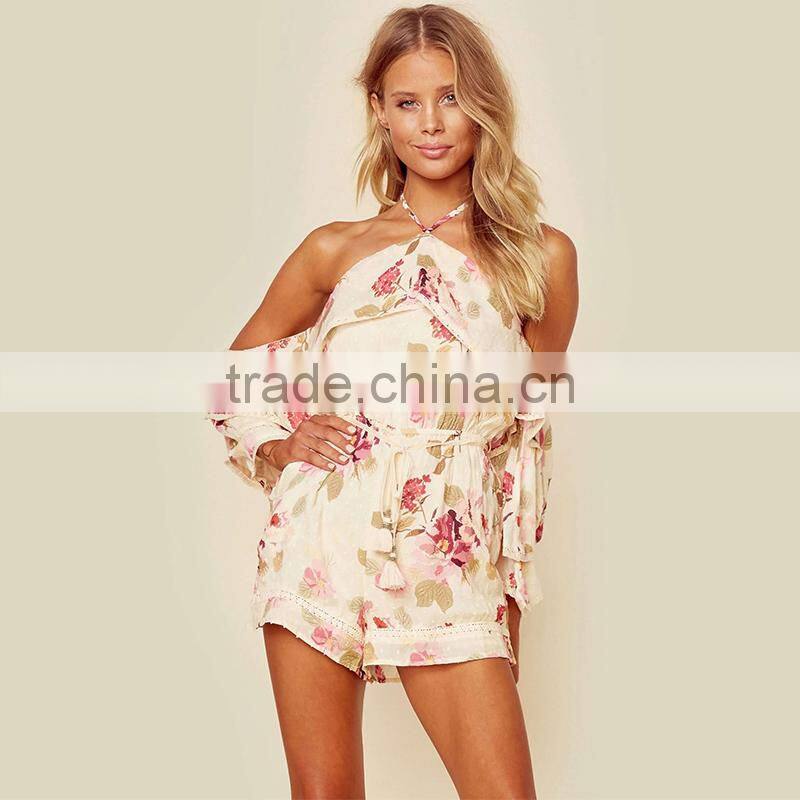 Floral Print Feminine Playsuits Allover Halter Drawstring Rompers