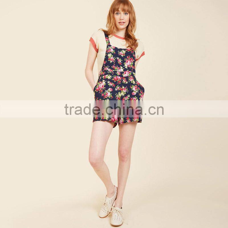 Navy Floral Wide Adjustable Straps Lady's Short Overall With Pockets