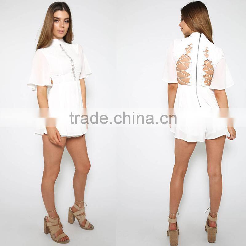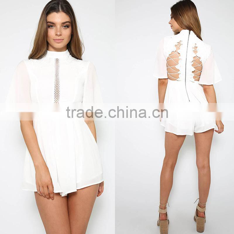 High neck lace zipper back white short jumpsuits women chiffon playsuit