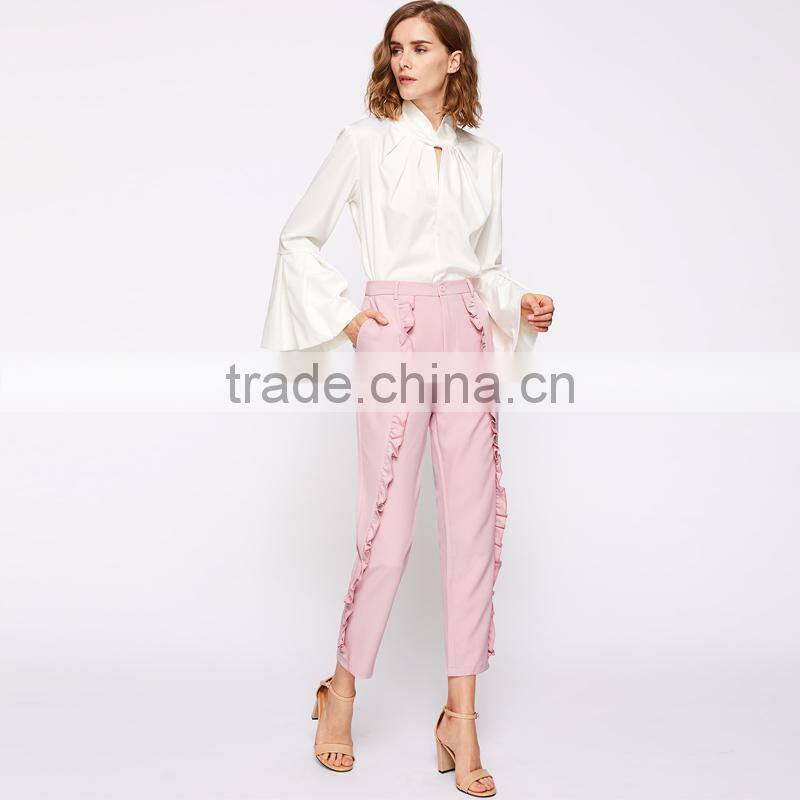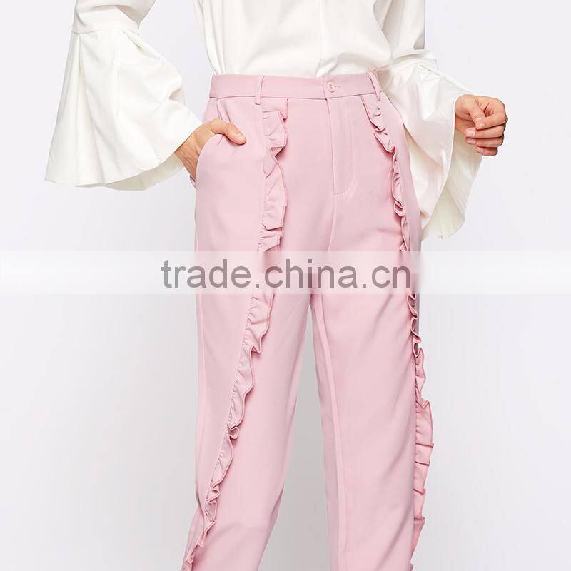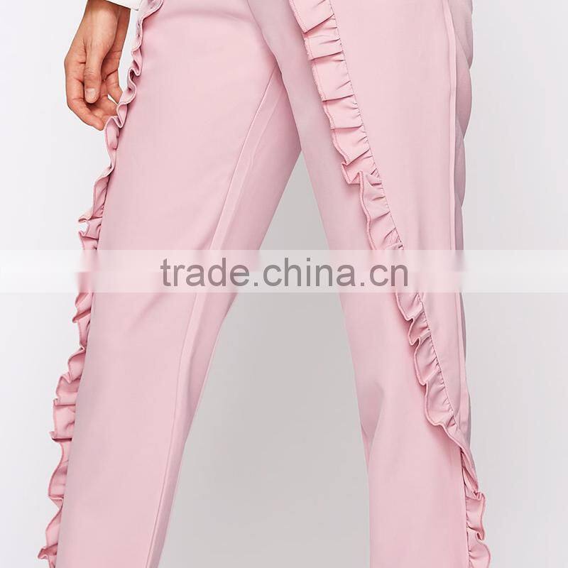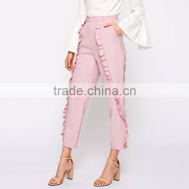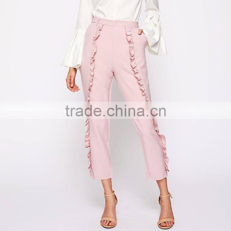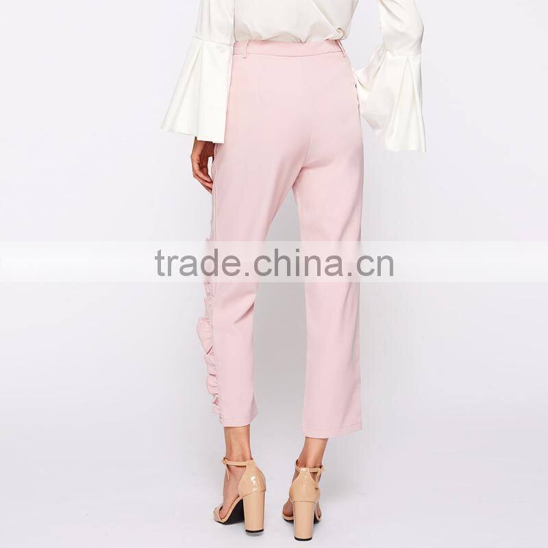 Frilled women's tailored fitted pants high waist pink cropped trousers