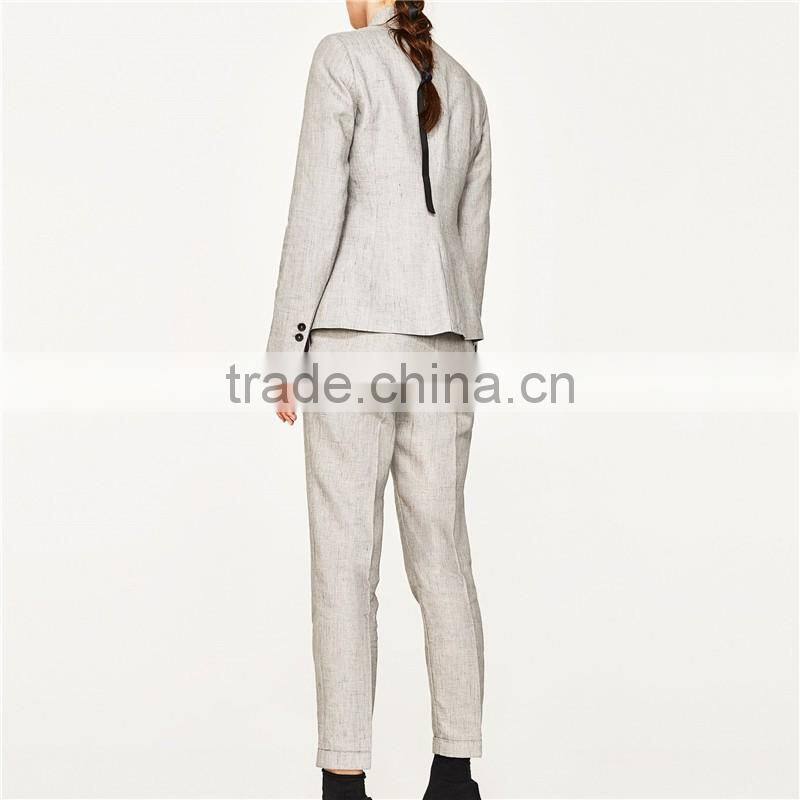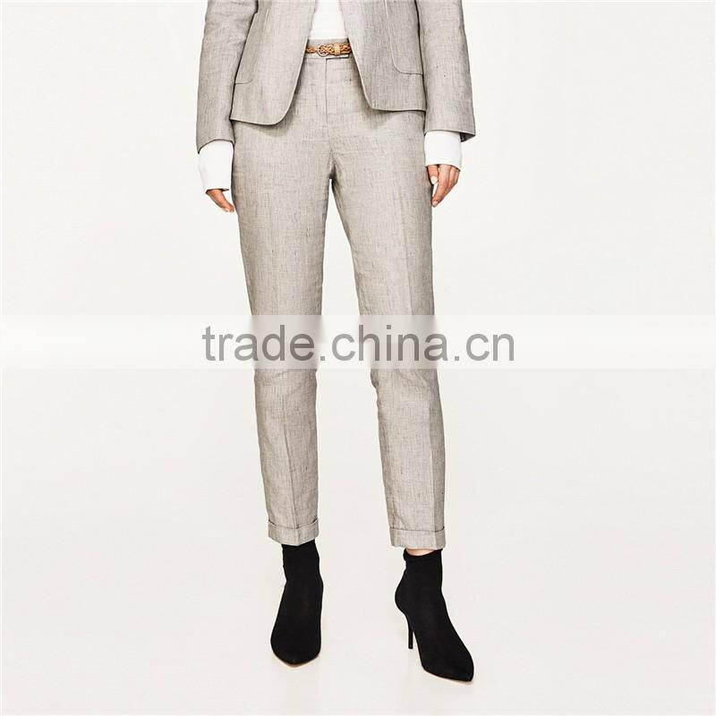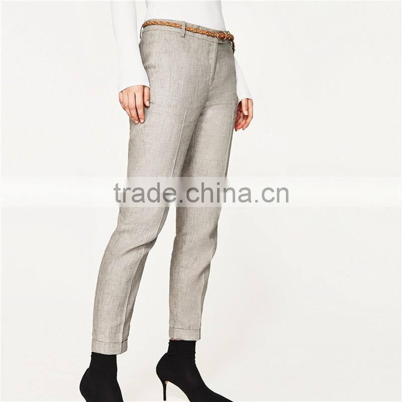 Elegant Fancy Roll-up Hem Linen Grey Dress Pants With Braided Belt