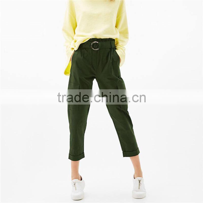 Green Twill Cargo Pants Womens Cropped Trousers With Belt and Buckle