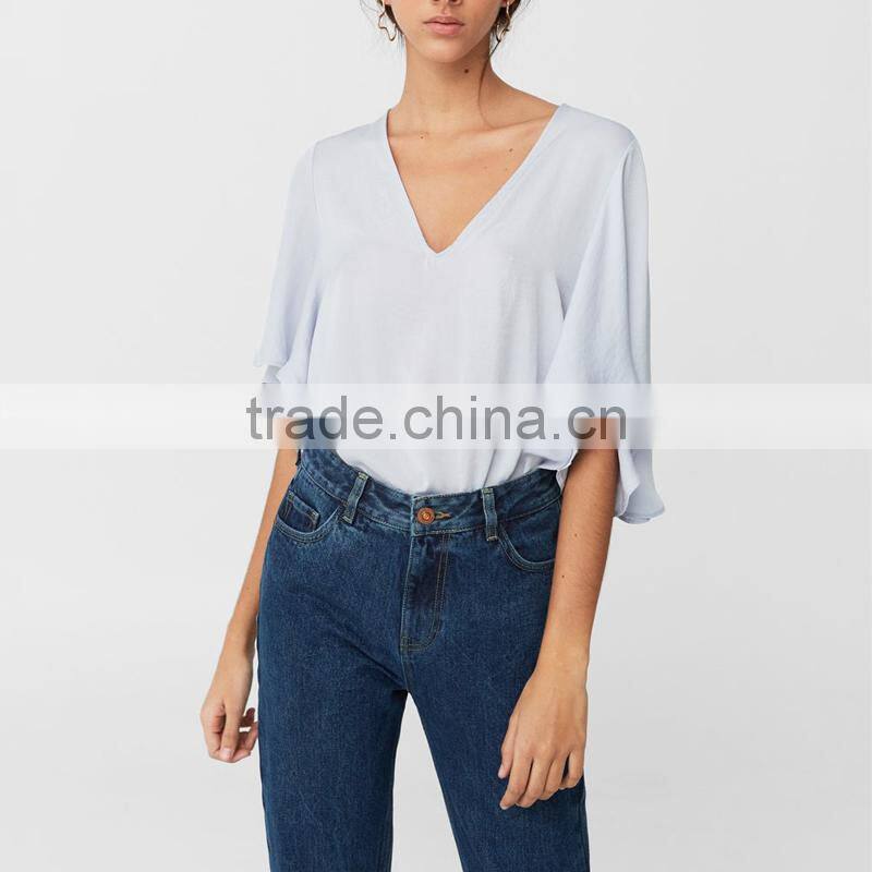 Light blue V neck bodysuit women casual frill sleeve blouse designs