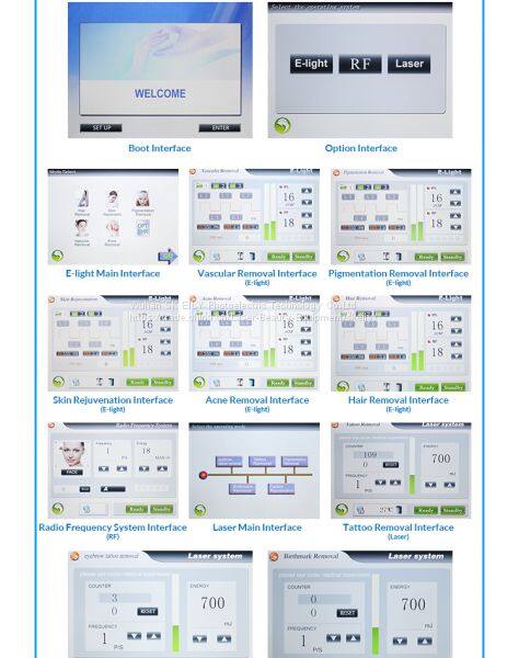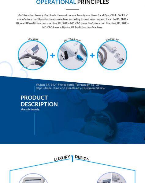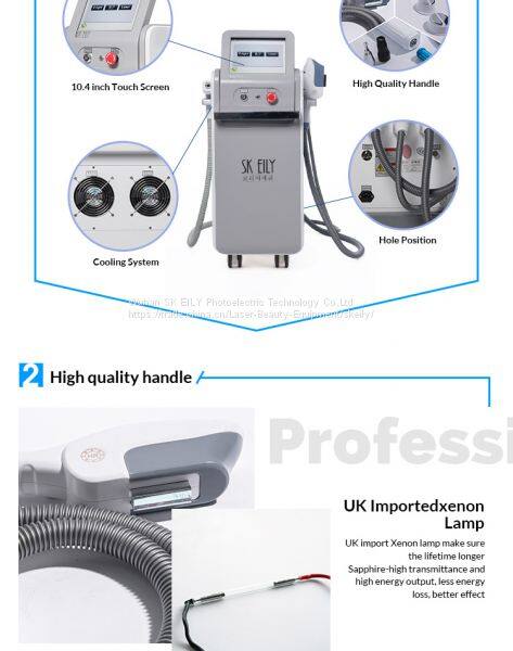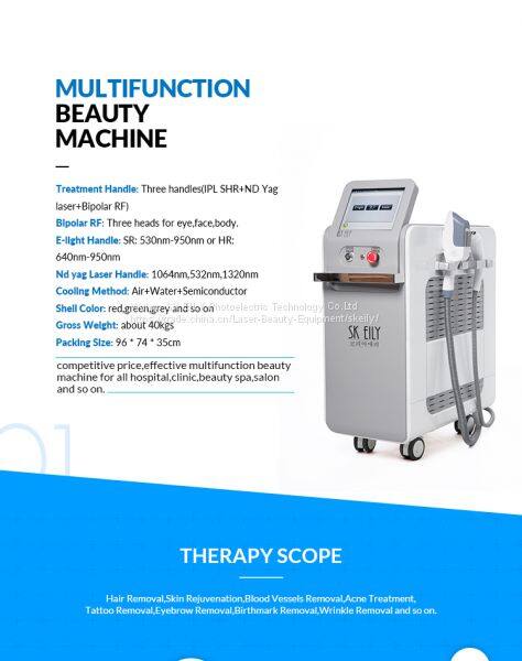 IPL SHR+ND YAG Laser+Bipolar RF multifunction beauty machine,one machine have more than ten major functions,more competitive and effective.Main functions include Hair removal,skin rejuvenation,acne removal,vascular removal,freckle removal,tattoo removal,birthmark removal,eyebrow removal,pigment removal and carbon laser treatment function(skin whitening,deeply clean skin and so on)