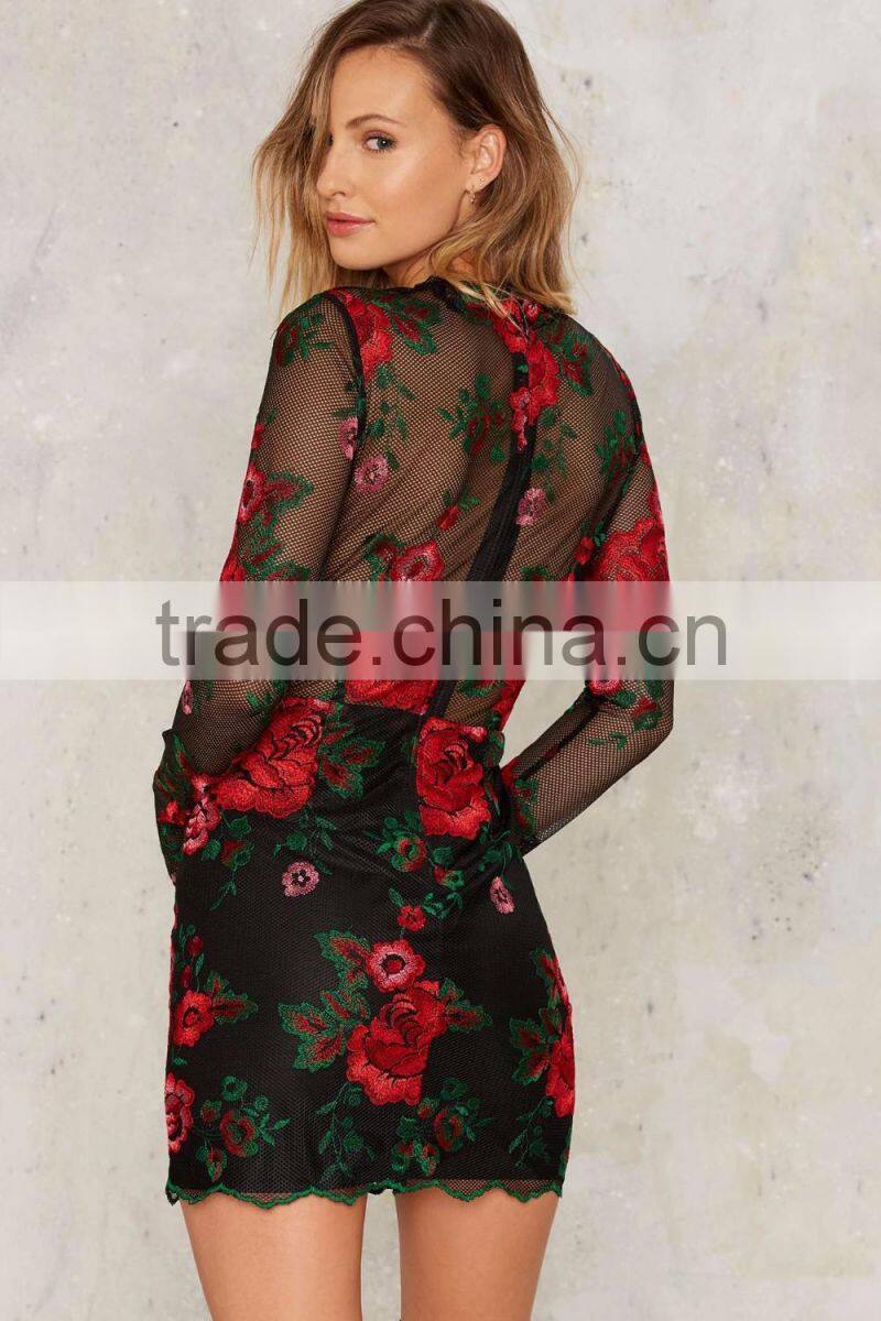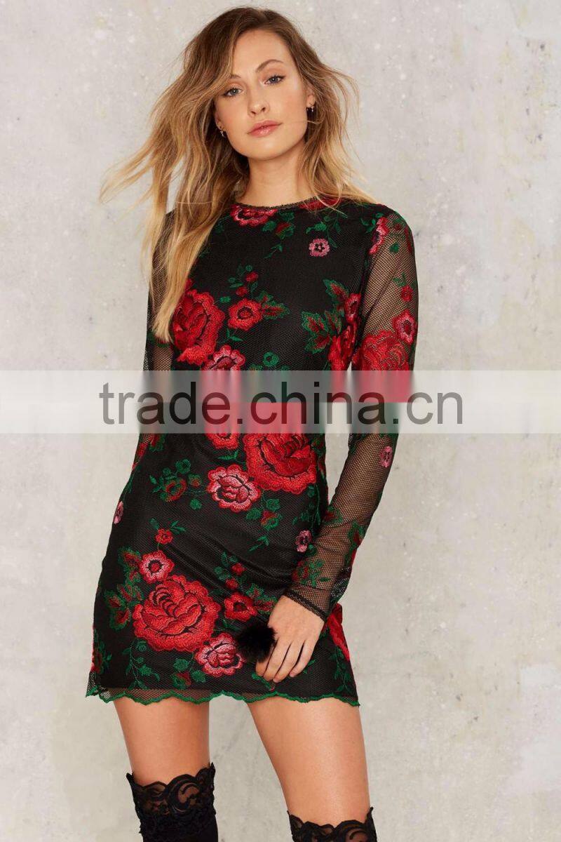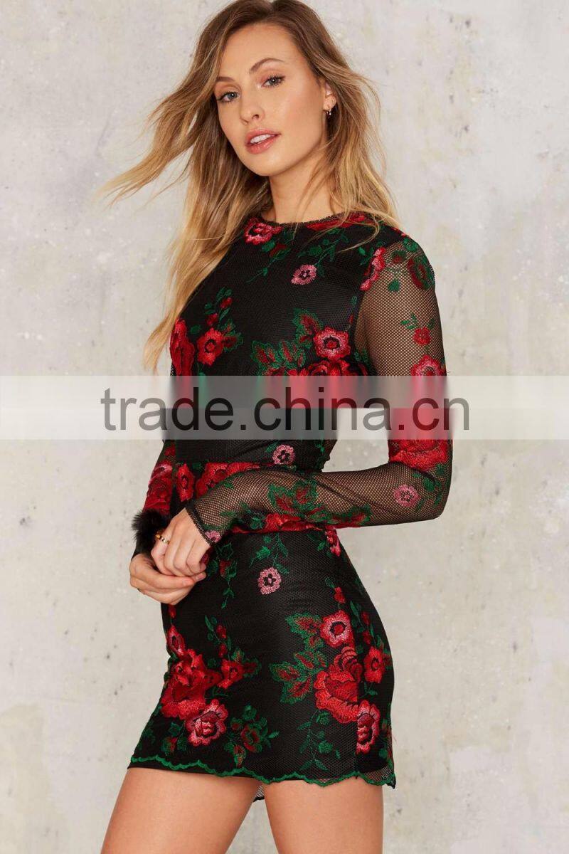 Embroidered Long Sleeve Latest Black Dress Women Party