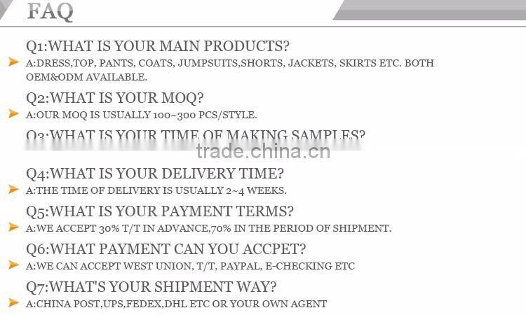 Our company has been focusing on woman wear for over 16 years now, since we established, we are specializing on exporting, now we are working with clients all over the world, mostly in UK, AU, USA, EU etc. Each year we customize many different new styles for them, mostly dresses, blouses, pants, jumpsuits etc. And now we have stable workers over 150, any new orders coming, could be finished within 2-4 weeks, welcome to order!
