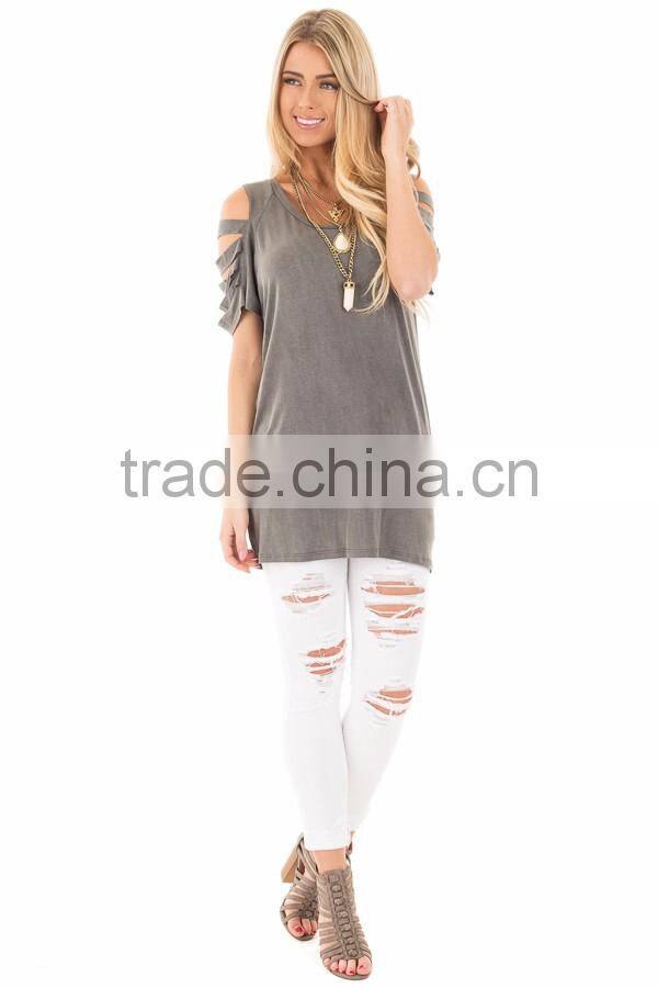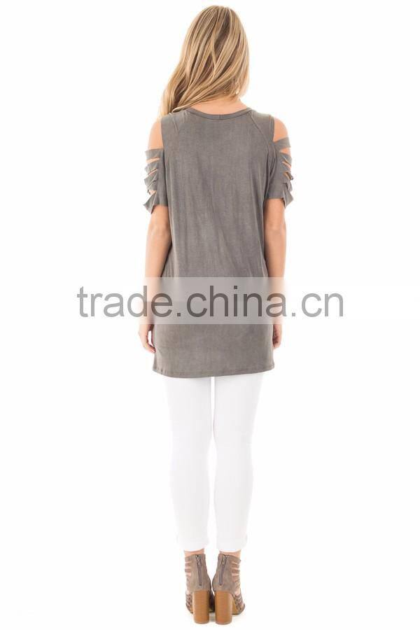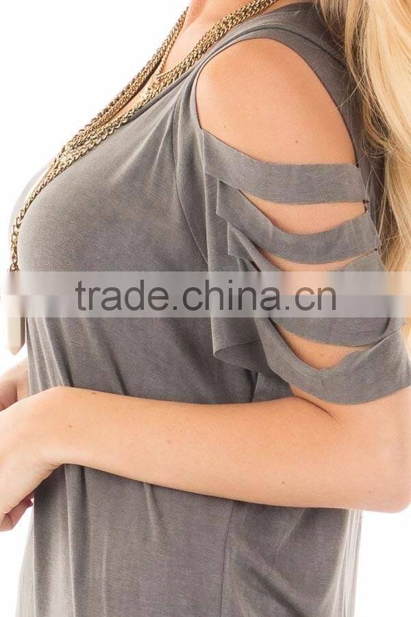 Charcoal Grey Women Sleeve Cut Out Polyester t Shirts