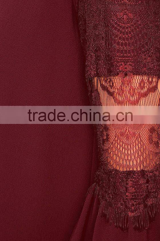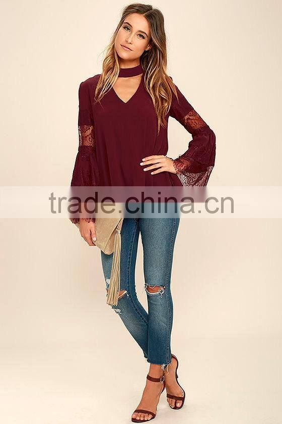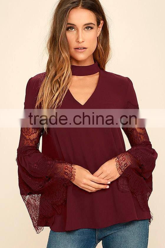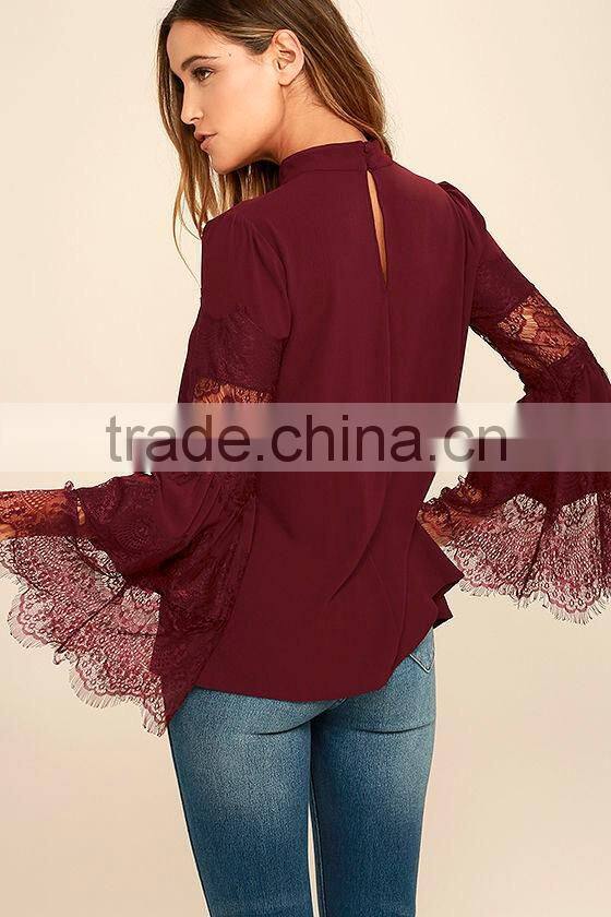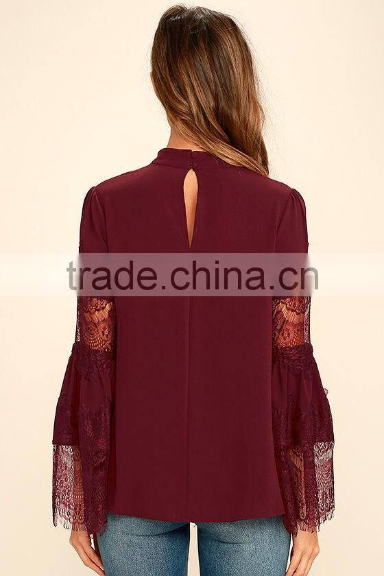 Long Sleeve Burgundy Red Lace Lady Blouse & Top
