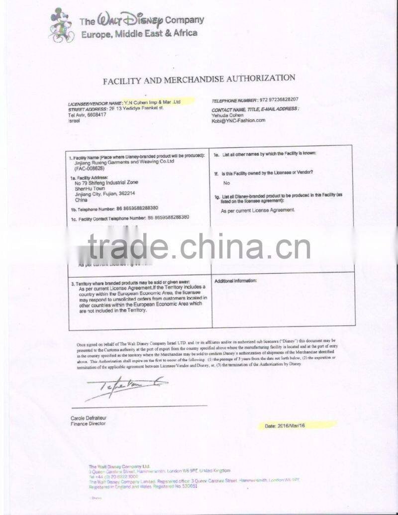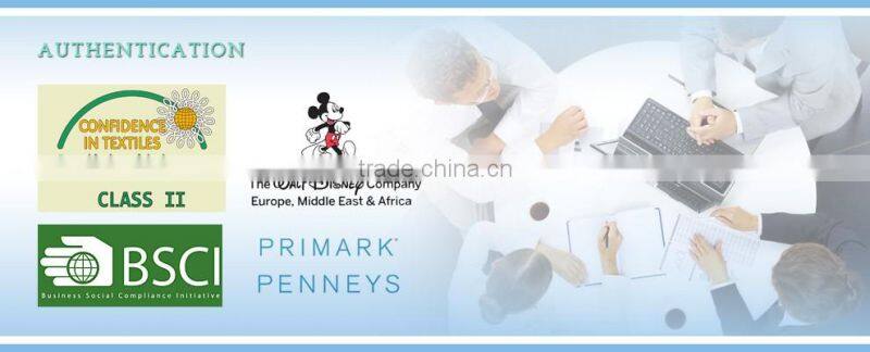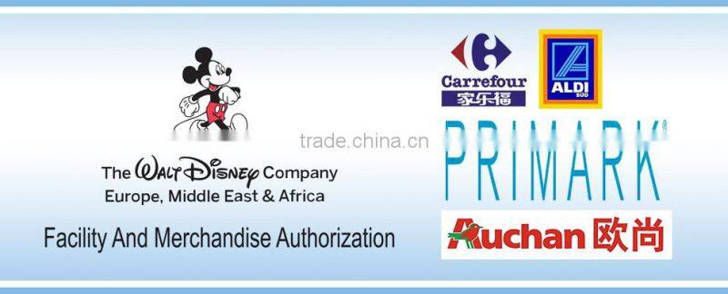We are BSCI,Disney and primark audit factory with OEKOTEX 100 certification .As result of the high quality products and outstanding customer service we gained a global sales network reaching Germany, Holland, USA, Belgium, UK, France and Canada etc. Our main customer are Zeeman, Target, Aldi, Action, Primark , Auchan and Pepco etc. We are looking forward to forming successful business relationship with new clients around the world in the near future .