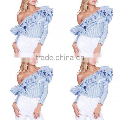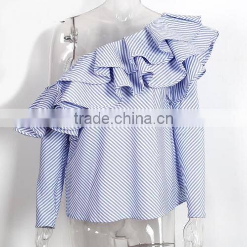 2017 New arrival fashion design women stripe off the shoulder high low long sleeve Blouse