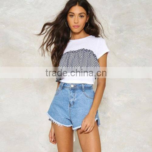 Mixed Fabric & Cotton Women Short Sleeve T-Shirts Different Size for Choice & False Two Piece Patchwork Plaid Black 85844