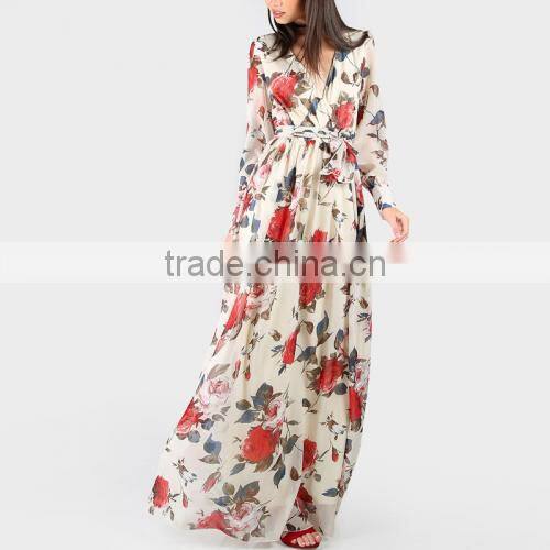One-piece Dress deep V printed floral beige Chiffon Dress