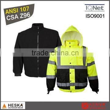 1.Hivi 3 in 1 bomber jacket 2.Two bottom pockets and one chest pocket 3. Detachable sleeve 4.Plastic zipper |
