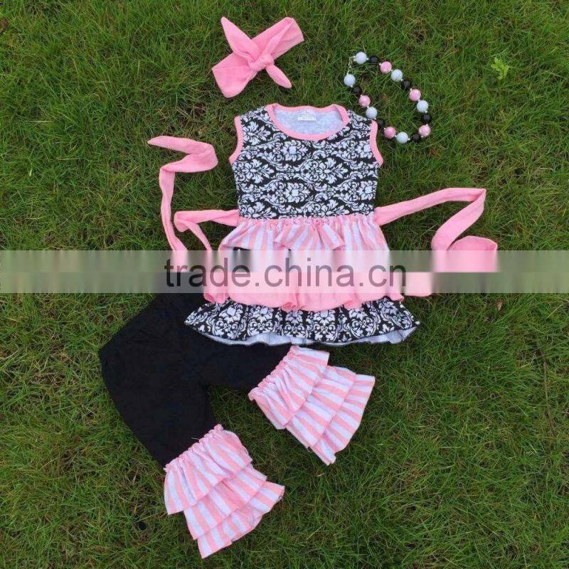 Full stock cute girls suit kids boutique-remake-clothing-sets girls ruffle capri sets girls damask rose necklace and headband