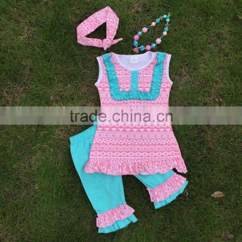 Baby girls pink Aztec tribal clothing set girls suit capri set outfits with matching headmade necklace and headband