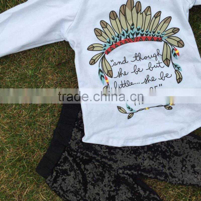 2016 new design "Fierce" feather long sleeves black sequins pants kids clothing girls clothes suit with matching accessories